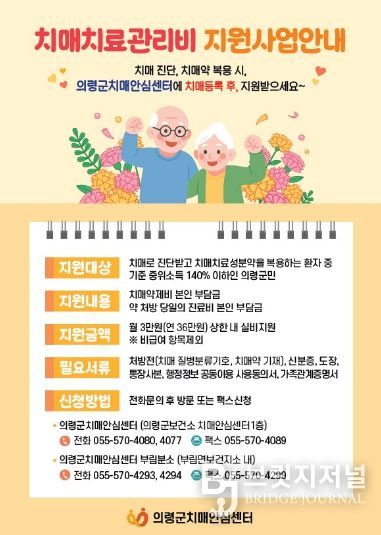 브릿지저널 김경미 기자 | 의령군은 치매치료관리비 지원사업의 대상자 선정 기준을 개선해 지원 대상을 확대한다고 밝혔다.