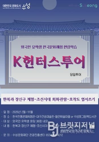브릿지저널 김진석 기자 | 대구 수성문화재단은 올해 2월부터 11월까지 대구·경북 외국인 유학생을 대상으로 한국문화체험 현장학습 ‘K헌터스 투어’를 운영한다.