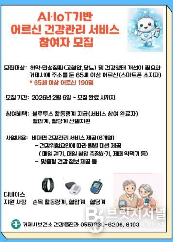 브릿지저널 김경미 기자 | 거제시보건소는 오는 3월부터 8월까지 65세 이상 어르신을 대상으로 AI·IoT기반 어르신 건강관리사업 참여자를 선착순 190명을 모집한다.