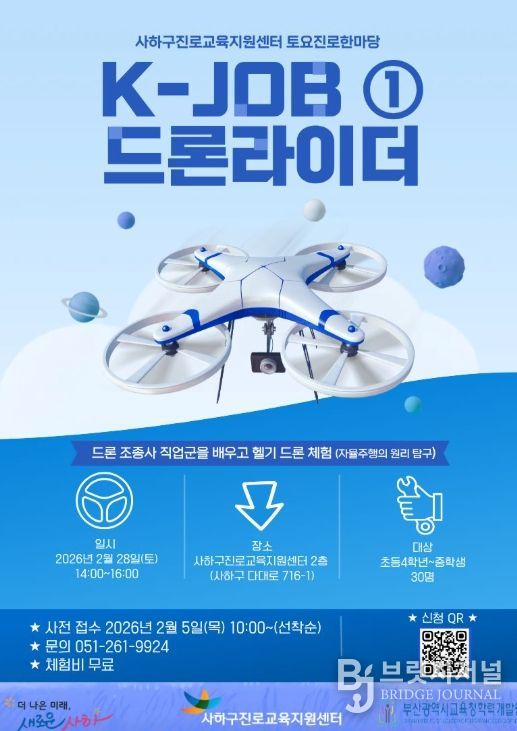 이번 프로그램은 K-JOB 드론 라이더 직업군에 대해 알아보고, 헬기 드론을 활용한 자율주행 원리를 체험·탐구해 보는 시간으로 2월 28일 토요일 오후 2시부터 사하구진로교육지원센터 2층에서 진행된다.