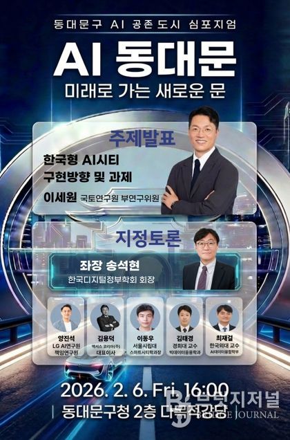심포지엄은 ‘미래로 가는 새로운 문, AI 동대문’을 주제로 열린다. 주제 발표는 이세원 국토연구원 부연구위원이 ‘한국형 AI 시티 구현 방향 및 과제’를 발표하고, 지정토론은 송석현 한국디지털정부학회 회장이 좌장을 맡는다. 토론에는 양진석 LG AI연구원 책임연구원(2026년 AI 트렌드와 동대문구의 접목 방향), 김용덕 액서스코리아 대표(2025년 인공지능 인식 조사), 이동우 서울시립대 스마트시티학과장(미래 모빌리티), 김태경 경희대 빅데이터응용학과 교수(AI 기반 디지털 웰니스), 최재걸 한국외대 AI데이터융합학부 교수(동대문 로컬 LLM 구축) 등이 참여한다.
