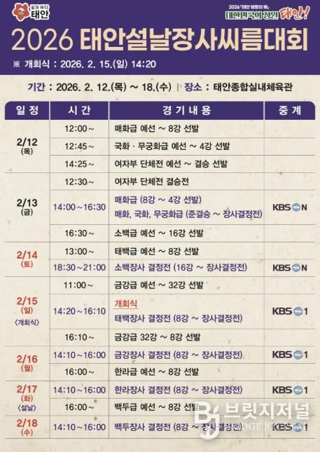 브릿지저널 정보영 기자 | 태안군이 민족 대명절 설을 맞아 2월 12일부터 18일까지 태안종합실내체육관에서 ‘위더스제약 2026 태안 설날장사 씨름대회’를 개최한다.