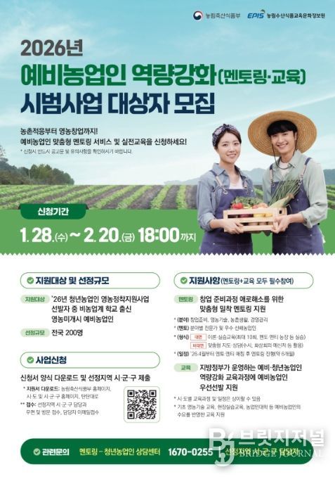 브릿지저널 김경미 기자 | 경상남도는 청년층의 농업 진입을 지원하기 위해 ‘예비농업인 역량강화 지원사업’을 2026년부터 신규 추진하고, 참여자를 모집한다고 밝혔다.