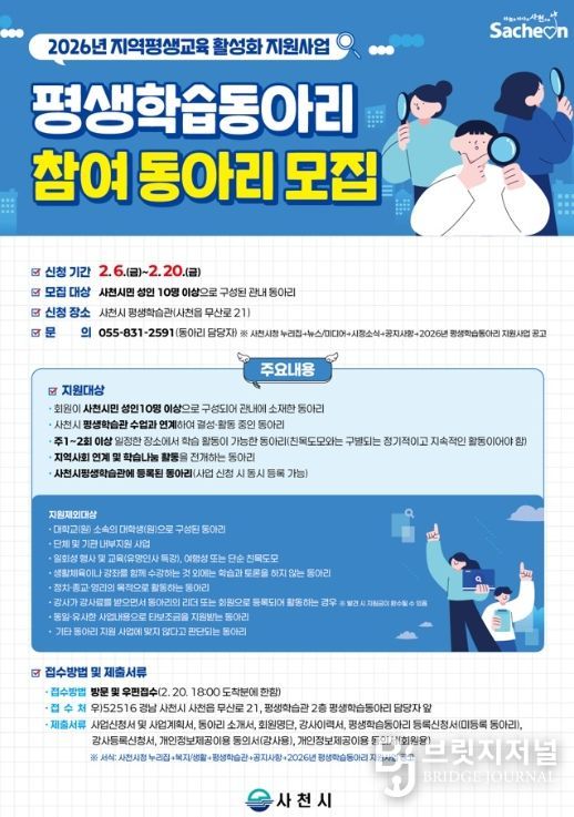 브릿지저널 김경미 기자 | 사천시는 평생학습도시로서 지역 특성을 반영한 평생학습 추진체계를 정비하고 중장기적 관점에서 지속 가능한 평생학습 기반 구축을 위해 '2026년 평생학습동아리 활성화 지원사업'을 추진한다.