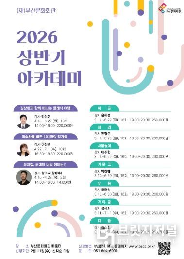 브릿지저널 윤나영 기자 | (재)부산문화회관은 오는 3월 9일부터 7월 1일까지 2026년도 상반기 정규 아카데미 강좌를 개설한다.
