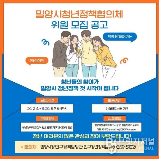 브릿지저널 김경미 기자 | 경남 밀양시는 오는 3월 20일까지 시정의 주역으로서 청년 문제를 논의하고 정책을 직접 발굴·제안할 청년정책협의체 구성원을 모집한다.