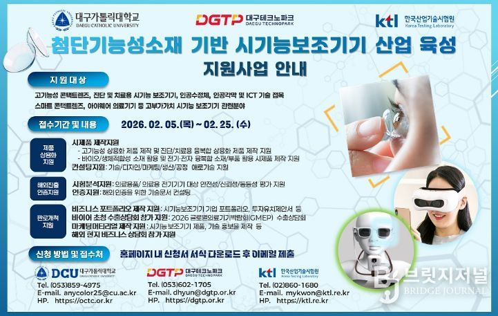 브릿지저널 김진석 기자 | 대구광역시는 산업통상부, 경상북도와 함께 ‘2026년 첨단 기능성 소재 기반 시(視)기능 보조기기 육성사업’을 본격 추진하고, 참여기업을 모집한다.