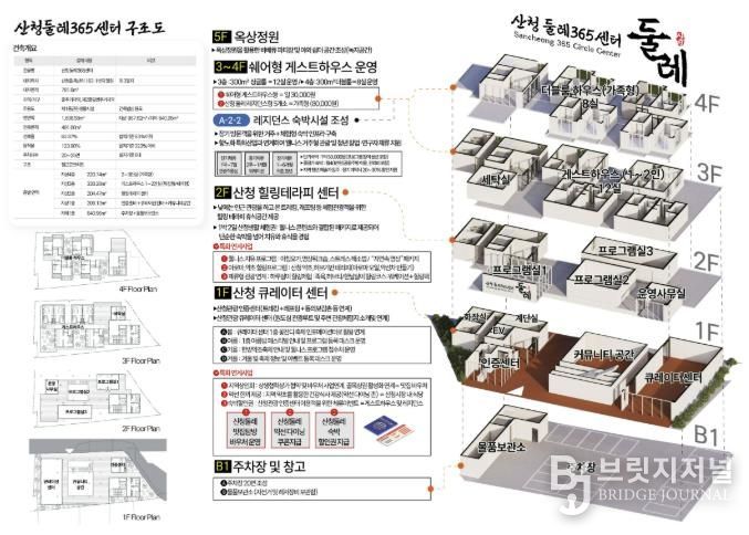 첫째, 산청읍 옥산리 163-1번지 일원에 총116억원을 투입, 지하1층 지상4층 규모로 편안한 둘레 체류공간을 위해 문화융복합 체류형 거점인 산청둘레 365센터가 조성되며, 거점연계 공간을 위해 리셉션광장과 공가를 활용한 레지던스 숙박시설을 조성하여 우리군을 찾는 관광객이 머물수 있는 공간으로 활용할 예정이다.