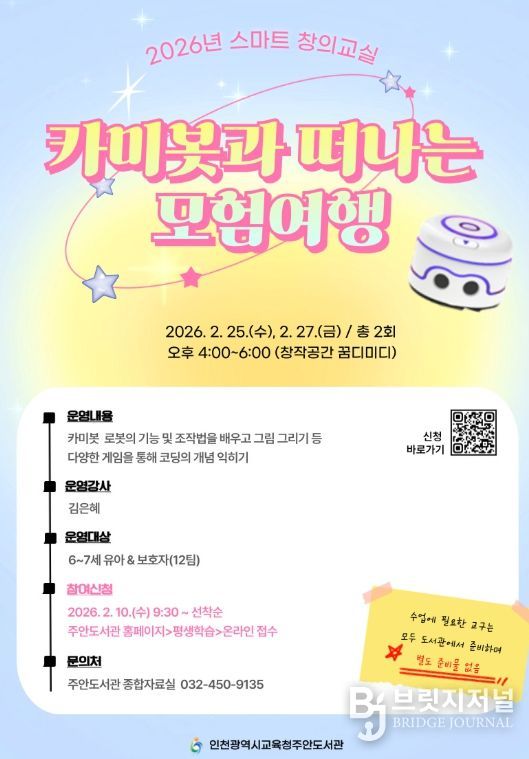 브릿지저널 김경미 기자 | 인천광역시교육청주안도서관은 스마트창의교실의 일환으로 ‘카미봇과 떠나는 모험여행’참여자를 모집한다.