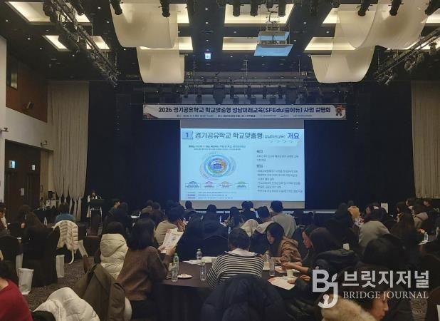 브릿지저널 김경미 기자 | 경기도성남교육지원청은 5일 밀리토피아호텔에서 관내 초·중·고·특수학교 교원 및 지자체 관계자 등 300여 명이 참석한 가운데 ‘2026 경기공유학교 학교맞춤형 성남미래교육(숲에듀) 사업설명회’를 개최했다.