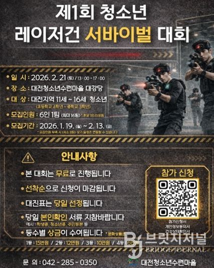 브릿지저널 정보영 기자 | 대전청소년수련마을은 지역 청소년의 건강한 여가문화 조성과 협동심 함양을 위해 ‘제1회 레이저건 서바이벌 대회’를 21일 개최한다.