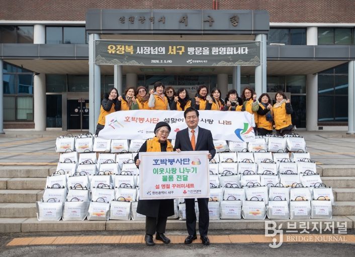 브릿지저널 김경미 기자 | 인천광역시 서구는 지난 5일 호박봉사단(단장 최정옥)으로부터 설명절 먹거리 꾸러미 150박스를 전달받았다.