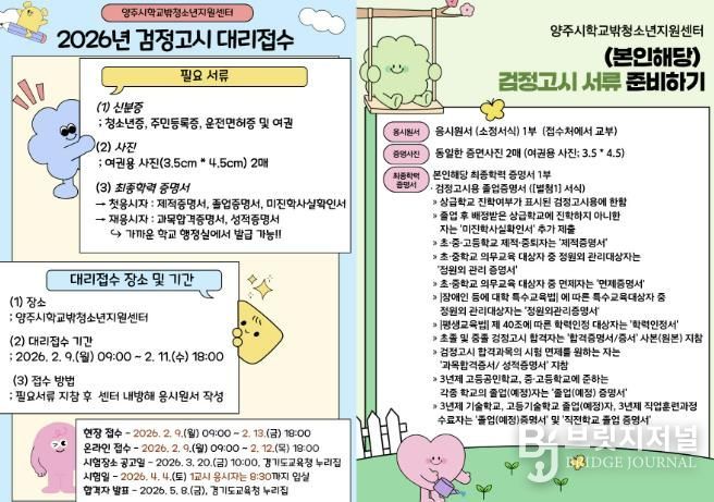브릿지저널 김경미 기자 | 양주시학교밖청소년지원센터에서는 학교 밖 청소년들을 위해 2026년 제1회 초중고 졸업 학력 검정고시 응시 원서 접수 대행을 지원한다.