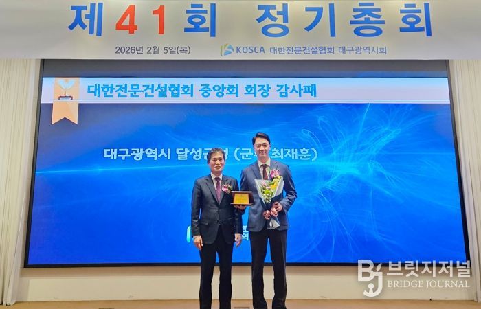 브릿지저널 김진석 기자 | 달성군은 지난 2월 5일 호텔인터불고에서 열린 대한전문건설협회 대구광역시회 제41회 정기총회에서 대한전문건설협회중앙회로부터 감사패를 수상했다.