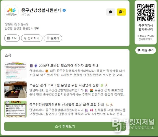 브릿지저널 정보영 기자 | 대전 중구는 주민들에게 보다 폭넓고 신속한 건강 정보와 중구건강생활지원센터에서 추진하는 각종 사업 정보를 제공하기 위해 카카오톡 채널을 개설・운영한다고 8일 밝혔다.