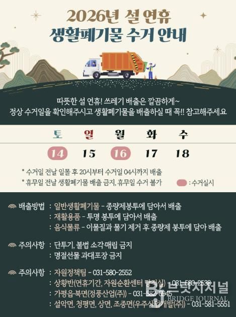 브릿지저널 김경미 기자 | 가평군은 설 명절을 맞아 군민과 방문객 모두가 쾌적한 환경에서 청결한 연휴를 보낼 수 있도록 생활폐기물 처리 대책을 마련했다.
