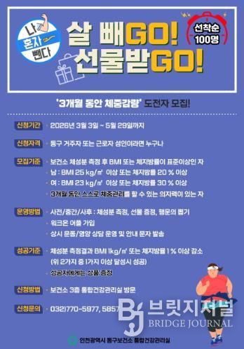 브릿지저널 김경미 기자 | 인천 동구보건소는 주민 스스로 건강한 체중 관리를 할 수 있도록 돕는‘나 혼자 뺀다! 살빼GO! 선물받GO!’프로그램 참여자를 모집한다고 밝혔다.