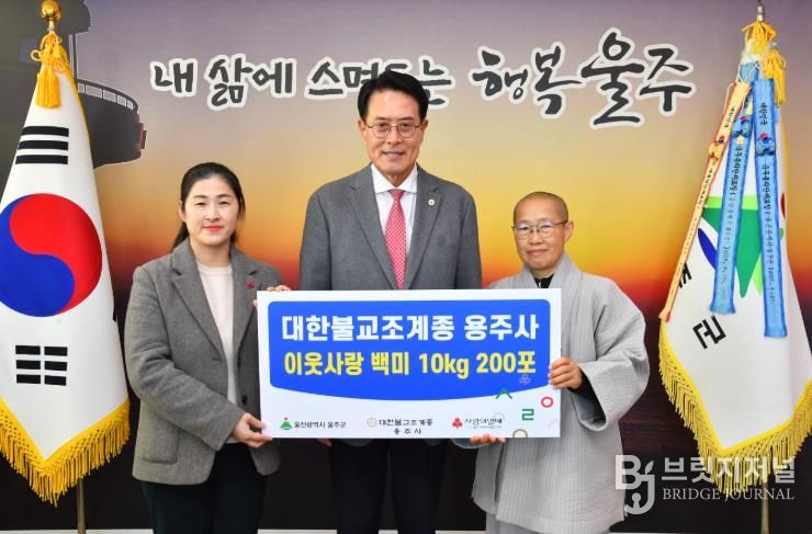브릿지저널 윤나영 기자 | 대한불교조계종 용주사가 9일 울주군 저소득세대를 돕기 위해 총 600만원 상당의 백미(10㎏) 200포를 전달했다.