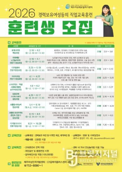 브릿지저널 정보영 기자 | 제주특별자치도가 경력 보유 여성과 재직 여성의 재취업을 돕기 위해 올해 여성새로일하기센터 직업교육훈련 과정에 참여할 296명을 모집한다.