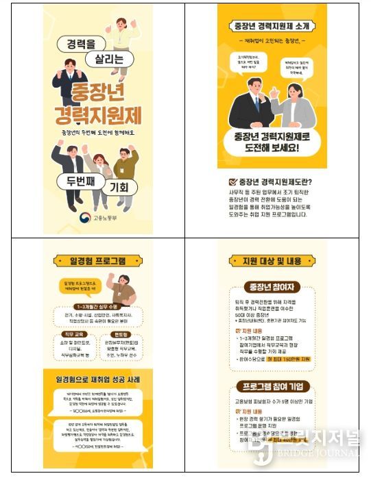 브릿지저널 정보영 기자 | 고용노동부는 퇴직 이후 새로운 분야로 재취업을 준비하는 중장년을 대상으로, 실제 직무 경험을 통한 경력 전환을 지원하는 “중장년 경력지원제”를 시행한다.