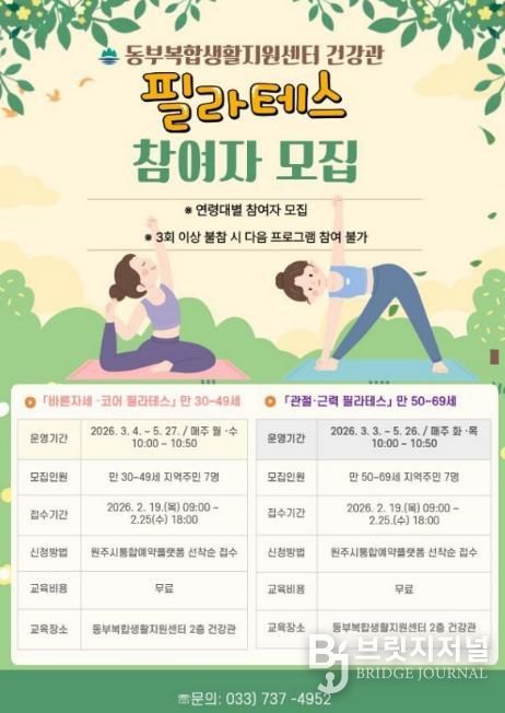 브릿지저널 윤나영 기자 | 원주시 동부복합생활지원센터 건강관은 오는 19일부터 중·장년을 대상으로 한 필라테스 프로그램 참여자를 모집한다.