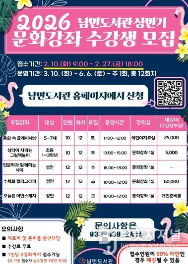 브릿지저널 윤나영 기자 | 홍천군립도서관은 2월 10일부터 2월 27일까지 2026년 상반기 독서문화강좌 수강생을 모집한다.