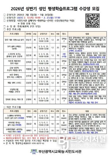 브릿지저널 윤나영 기자 | 부산광역시립시민도서관(관장 이은경)은 3월부터 5월까지 유아, 어린이, 성인 등 560여 명을 대상으로 26개 평생학습프로그램을 운영한다. 프로그램은 전 연령층의 다양한 학습 수요를 반영해 구성했으며, 특히 어린이 대상 문해력·수리력 등 기초역량 강화 프로그램을 확대 운영한다.