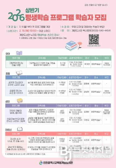 브릿지저널 김경미 기자 | 인천광역시교육청계양도서관은 학생과 지역주민에게 다양한 배움과 자기계발의 기회를 제공하기 위하여 오는 19일부터 ‘2026년 상반기 평생학습 프로그램’학습자를 모집한다.