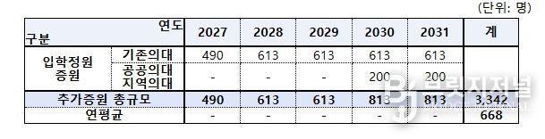 브릿지저널 김경미 기자 | 보건복지부는 2월 10일 오후 2시, 정부서울청사(서울 종로구 소재)에서 제7차'보건의료정책심의위원회'(이하 보정심)를 개최하여 지역․필수․공공의료 강화를 위해 서울을 제외한 32개 의과대학을 대상으로 2027년부터 2031년까지 의사인력 양성 규모를 연평균 668명 늘리기로 결정했다. 기존 의대 증원 인원 중 2024학년도 정원(3,058명)을 초과하는 부분은 모두 지역의사로 선발된다. 또한 증원 초기 의학교육 현장의 부담을 완화하기 위하여 단계적으로 증원을 추진한다.
