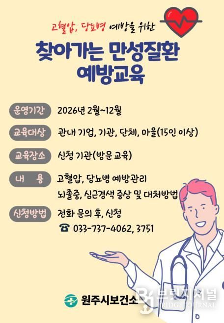 브릿지저널 윤나영 기자 | 원주시보건소는 2월부터 12월까지 지역 주민을 대상으로 고혈압·당뇨병 등 만성질환 예방교육을 운영한다.