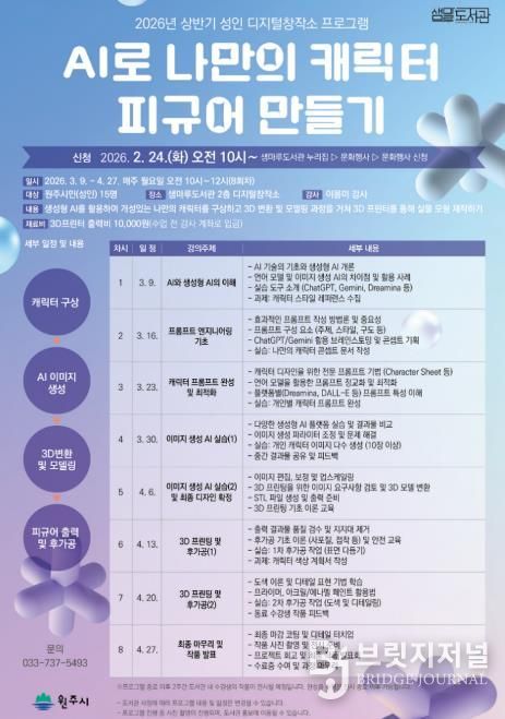 브릿지저널 윤나영 기자 | 원주시 샘마루도서관은 서부권 시민들의 디지털 창작 역량 증진을 위해 오는 3월부터 ‘상반기 성인 디지털창작소 프로그램’을 운영한다.