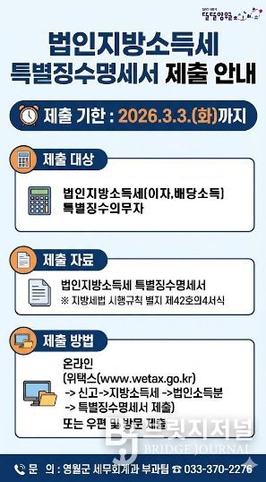 브릿지저널 윤나영 기자 | 영월군은 법인지방소득세 이자‧배당소득 특별징수의무자를 대상으로 3월 3일까지 특별징수명세서를 제출해야 한다고 밝혔다.