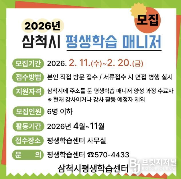 브릿지저널 윤나영 기자 | 삼척시는 2월 11일부터 20일까지 평생학습 매니저 양성과정 수료자를 대상으로 2026년 삼척시 평생학습 매니저를 모집한다고 밝혔다.
