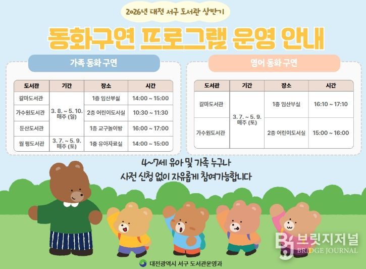 브릿지저널 정보영 기자 | 대전 서구 4개 공공도서관(갈마ㆍ가수원ㆍ둔산ㆍ월평)은 주말 온 가족이 함께 즐길 수 있는 가족 동화구연 및 영어 동화구연 프로그램을 운영한다.