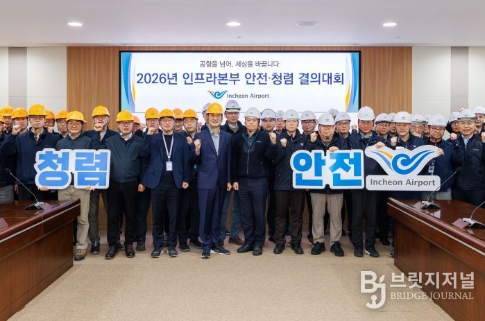 브릿지저널 김경미 기자 | 인천국제공항공사는 안전하고 투명한 공항운영 환경 조성을 위해 지난 10일 공사 대회의실에서 인천공항시설관리(주)와 함께 ‘2026년 인천공항 안전·청렴 결의대회’를 개최했다고 11일 밝혔다.