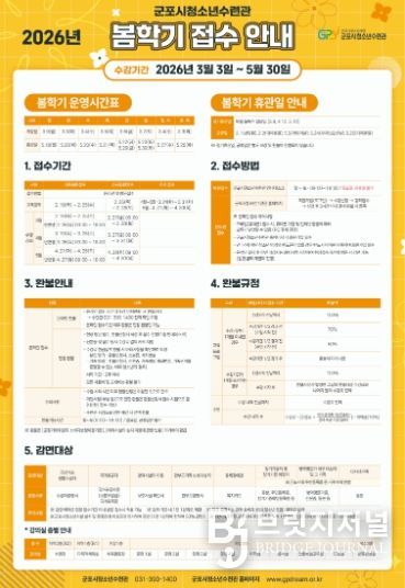 브릿지저널 김경미 기자 | (재)군포시청소년재단 군포시청소년수련관은 오는 2026년 3월 3일부터 5월 30일까지 ‘2026년 봄학기 문화체육 프로그램’을 운영하며, 2월 26일부터 신규 수강생 접수를 시작한다.