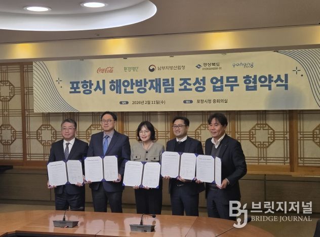 브릿지저널 정보영 기자 | 경상북도산림환경연구원은 2월 11일, 포항시청에서 한국 코카-콜라, 환경재단, 남부지방산림청, 포항시와 포항시 흥해읍 용한리 일원 해안방재림 조성사업을 위한 업무협약을 체결했다.