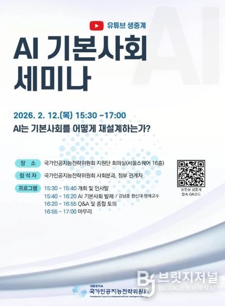 브릿지저널 김경미 기자 | 국가인공지능전략위원회는 2월 12일 오후 3시 30분부터 AI 기본사회 세미나를 개최한다. 이번 세미나는 AI 기술 확산이 노동ㆍ복지ㆍ분배ㆍ사회안전망 등 경제ㆍ사회 정책 전반에 미치는 영향을 종합적으로 살펴보고, AI 시대에 부합하는 기본사회 제도 설계 방향에 대한 시사점을 도출하기 위해 마련됐다. 특히 AI 기술의 확산에 따라 부와 생산수단이 특정 주체에 집중됨과 동시에 고용ㆍ소득 양극화를 포함한 구조적 변화가 예상되는 상황에서, 기본사회 정책이 어떤 역할과 방향성을 갖고 추진되어야 하는지에 대한 심도 있는 논의가 진행될 예정이다.