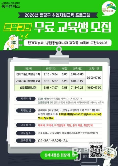 브릿지저널 김경미 기자 | 서울 은평구는 구민의 취업역량 강화를 위해 ‘2026년 은평구 취업지원교육 프로그램’ 교육생을 모집한다고 밝혔다.
