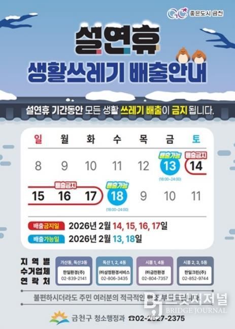 브릿지저널 김경미 기자 | 금천구는 설 연휴 기간 생활쓰레기(일반생활쓰레기, 음식물쓰레기, 재활용품) 수거를 일시 중단한다고 밝혔다.