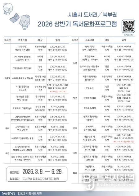 브릿지저널 김경미 기자 | 시흥시 북부권 8개 공공도서관(소래빛ㆍ대야ㆍ목감ㆍ능곡ㆍ장곡ㆍ은계ㆍ신천ㆍ매화)은 오는 3월부터 6월까지 상반기 독서문화 프로그램 26개를 운영하고, 시민 292명을 대상으로 다양한 독서·문화 체험 기회를 제공한다.