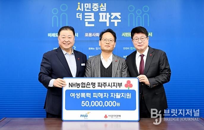 브릿지저널 김경미 기자 | 파주시는 지난 11일 엔에이치(NH)농협은행 파주시지부가 여성폭력 피해자의 자립과 회복을 지원하기 위한 후원금 5천만 원을 기탁했다고 밝혔다.