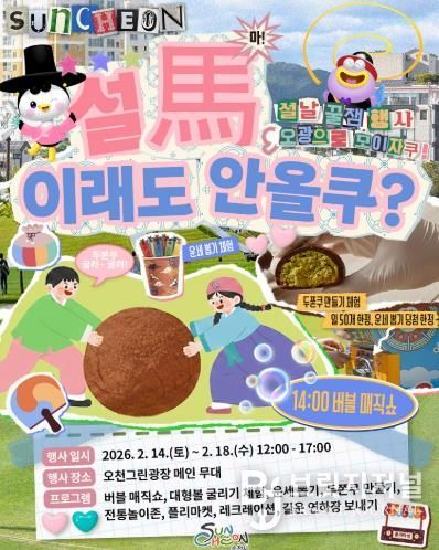 브릿지저널 김경미 기자 | 순천시는 설 명절 기간 시민과 귀성객이 함께 즐길 수 있는 참여형 문화 프로그램 '설馬, 이래도 안올쿠?'를 오는 14일부터 18일까지 오천그린광장에서 운영한다.