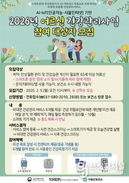 참여 대상자는 65세 이상 어르신으로, 9일부터 오는 3월 13일까지 120명을 선착순 모집하고 있다. 신청은 가평군보건소 1층 심뇌혈관질환실 방문 또는 전화(031-580-2010, 2838)로 가능하다. 사업 기간은 5월부터 10월까지 약 6개월이다.