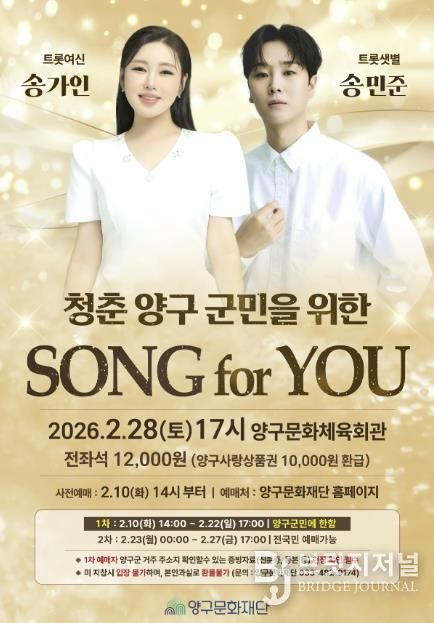 브릿지저널 윤나영 기자 | 양구문화재단은 다가오는 봄을 맞아 양구군민의 문화 향유 기회를 확대하고 지역에 활력을 불어넣기 위해 2월 기획 콘서트 ‘SONG FOR YOU’양구군민 콘서트를 개최한다.