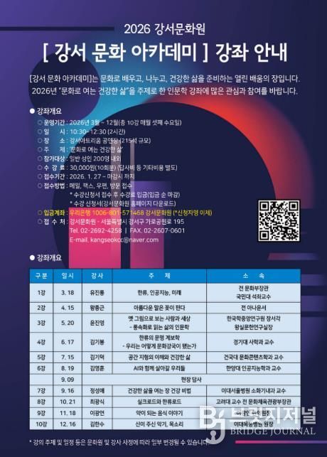 브릿지저널 김경미 기자 | 서울 강서구 강서문화원(원장 김진호)은 오는 3월부터 12월까지 주민들의 인문학적 역량을 키우고 건강한 삶을 위한 ‘2026 강서 문화 아카데미’를 개최한다고 밝혔다.