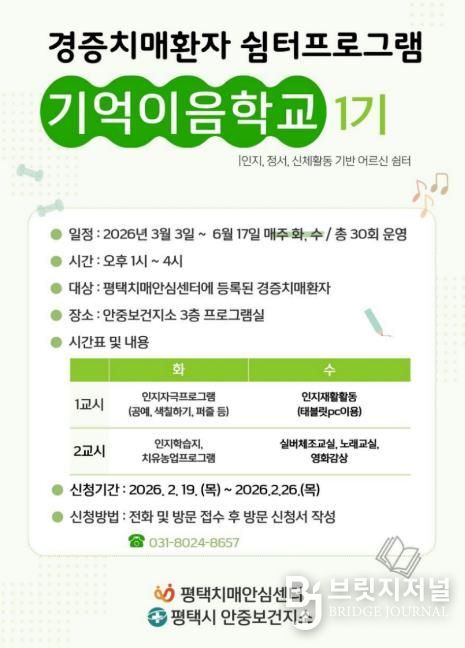 브릿지저널 김경미 기자 | 평택시 안중보건지소는 경증 치매 환자의 인지기능 유지와 일상생활 지원을 위해 오는 3월 3일부터 6월 17일까지 경증 치매 환자 쉼터 프로그램 ‘기억이음학교 1기’를 운영한다.