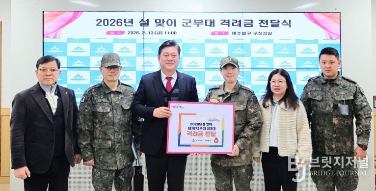 브릿지저널 김경미 기자 | 인천 미추홀구는 13일 설 명절을 맞아 국토방위와 국가안보를 위해 헌신하는 군 장병들의 노고를 격려하기 위해 미추홀구 관교동 승학산에 위치한 육군 제7873부대 2대대에 격려금을 전달했다.