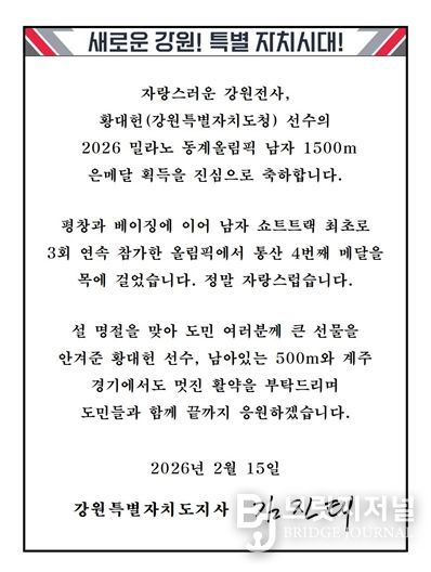 브릿지저널 윤나영 기자 | 김진태 도지사는 15일 2026 밀라노-코르티나담페초 동계올림픽대회 남자 쇼트트랙 1,500m에서 은메달을 획득한 강원특별자치도 소속 국가대표 황대헌 선수를 축하하며 축전을 보냈다.
