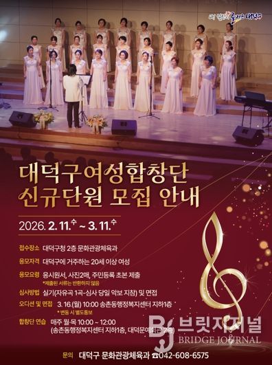 구는 3월 11일까지 ‘대덕구여성합창단’ 일반단원 15명 이내를 선발한다고 밝혔다. 지원 자격은 대덕구에 거주하는 20세 이상 여성으로, 성악 경험과 소질을 갖춘 주민이면 지원할 수 있다.